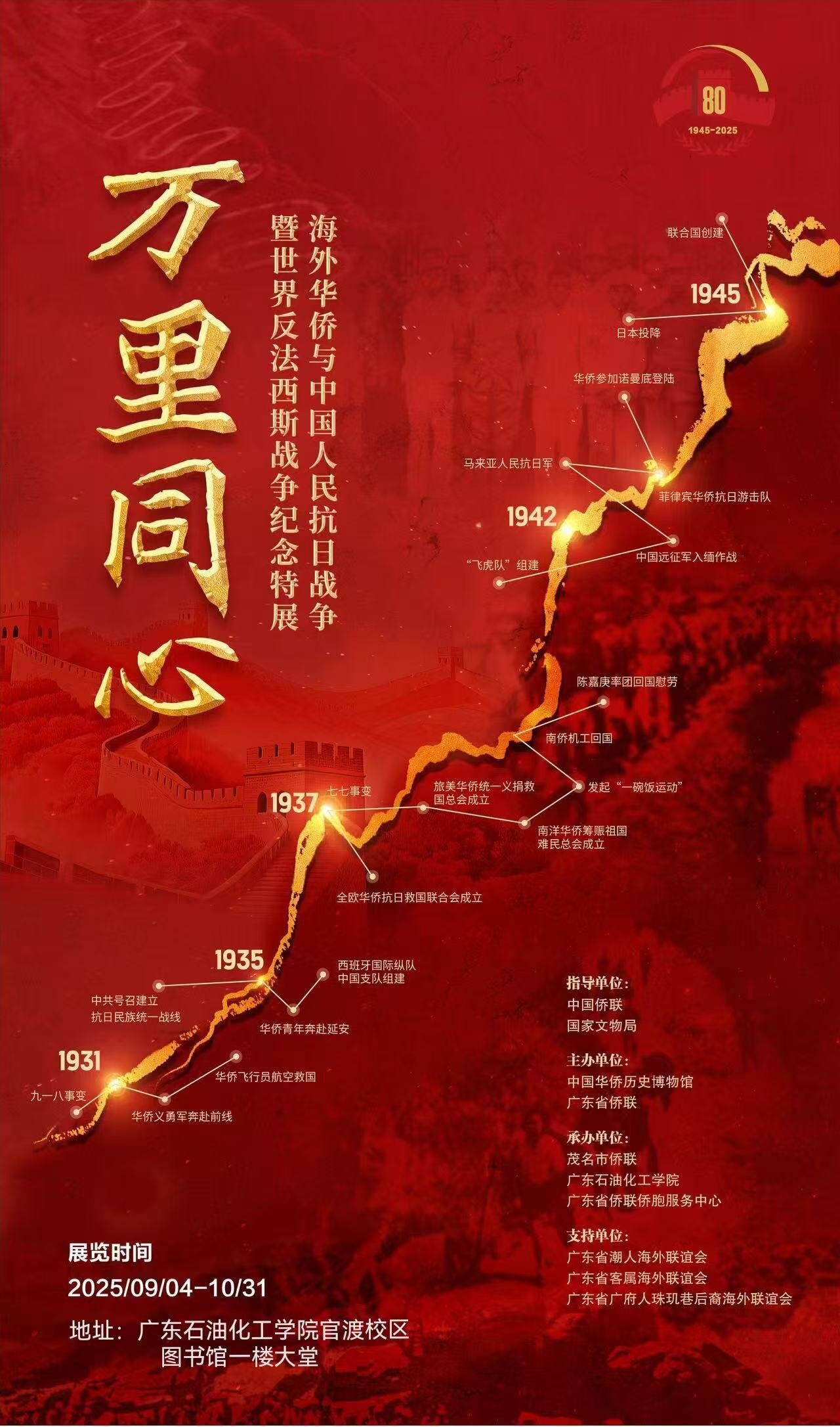为铭记历史、缅怀先烈,弘扬爱国主义精神,加强青年学子对中国人民抗日战争暨世界反法西斯战争历史的认识,“万里同心——海外华侨与中国人民抗日战争暨世界反法西斯战争纪念特展”将于9月4日至10月31日在广东石油化工学院官渡校区图书馆一楼大堂展出。该特展由中国侨联、国家文物局指导,中国华侨历史博物馆、广东省侨联主办,茂名市侨联、广东石油化工学院、广东省侨联侨胞服务中心承办。