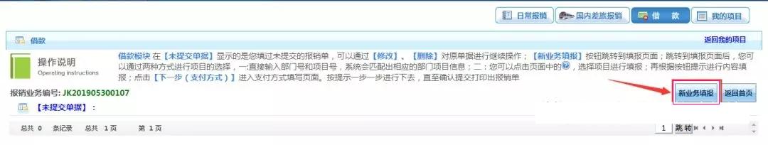 2、【新业务填报】按钮跳转到填报页面;跳转到填报页面后,您可以通过两种方式进行项目的选择,一:直接输入部门号和项目号,系统会匹配出相应的部门项目信息;二:您可以点击页面中的,选择项目进行填报;再根据按钮提示进行内容填报;点击【下一步(支付方式)】进入支付方式填写页面。