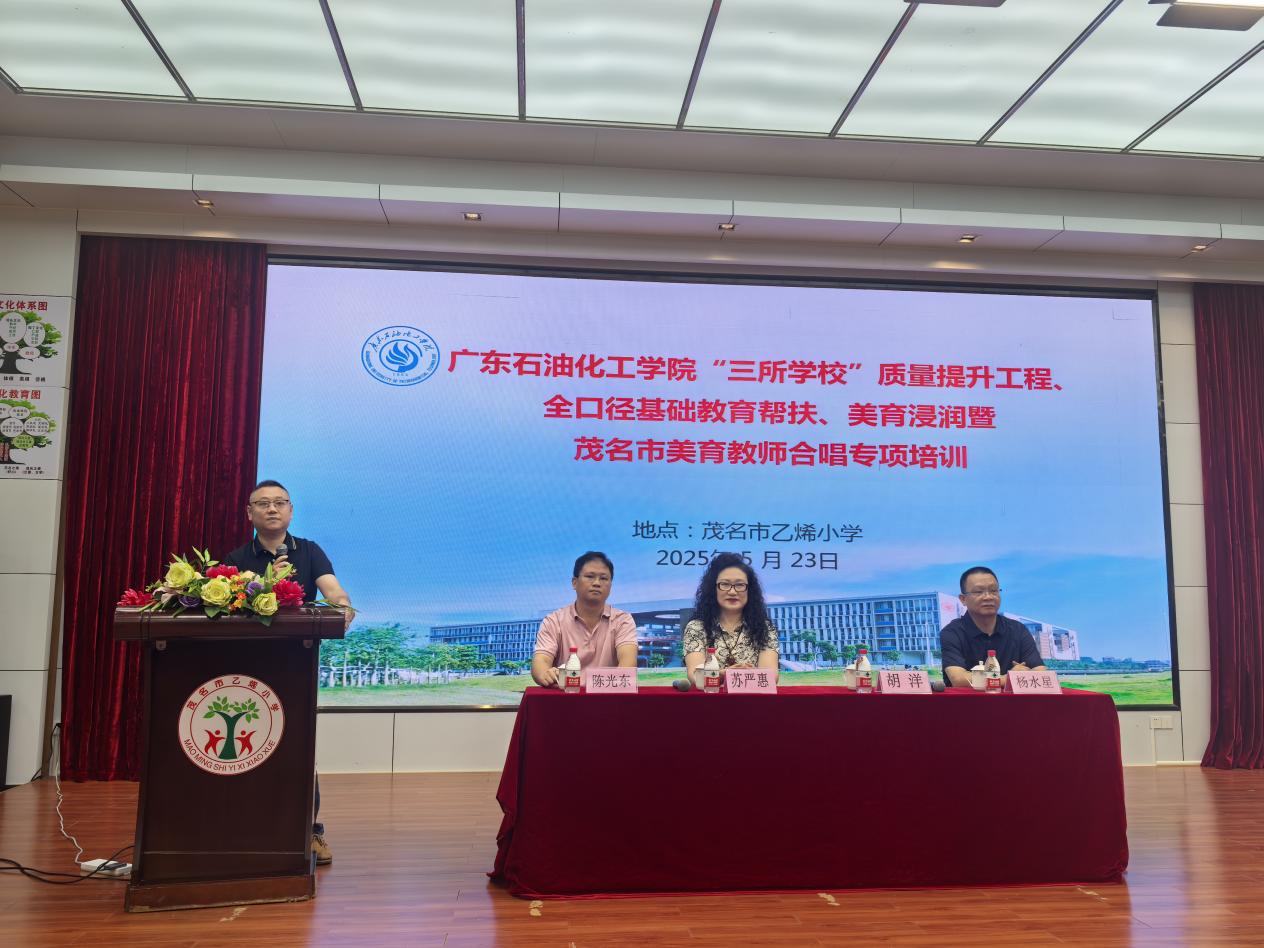 2025年5月23日,广东石油化工学院“双百行动”、“三所学校”和县中质量提升工程、全口径基础教育帮扶、美育浸润暨茂名市美育师资合唱专项培训活动在茂名市乙烯小学立志厅举行,茂名市乡村美育教师合唱团团员及来自各县市“三所学校”美育教师共140余人参加。本次活动由广东石油化工学院、茂名市教育局主办,广东石油化工学院艺术学院、茂名市教育局体卫艺科、广东省本科高校蒋快安美育名师工作室承办,茂名市乙烯小学协办。