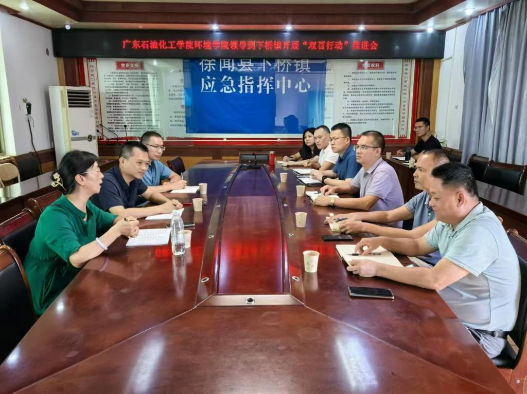 调研组首先到下桥镇政府,与镇领导一起召开下桥镇“双百行动”推进会,会议由下桥镇党委书记廖哲龙同志主持,双方在今年4月份“双百行动”座谈会形成的成果的基础上,继续就下桥镇乡村污水处理问题、环保办工作人员专业能力提升问题、农产品产业发展问题等多方面进行了深入的交流和探讨,并就如何发挥我院师资技术优势,开展针对性帮扶,形成了清晰的合作意向和下一步工作推进的初步计划。