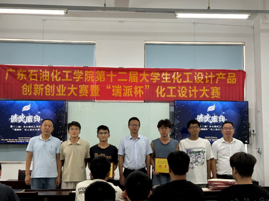 9月11日,广东石油化工学院第十二届“瑞派杯”化工设计大赛颁奖典礼在化工楼C104举行,化学工程学院院长余长林教授、党委副书记纪玉刚、《化工设计》课程负责人陈辉教授出席会议,并为获奖代表颁发荣誉证书。