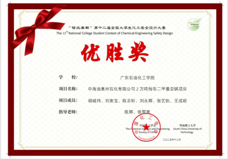 近日,“信立泰杯”第十二届全国大学生化工安全设计大赛落下帷幕,经过7个多月的艰苦努力和奋力拼搏,由陈辉教授、张帮亮和黄燕青老师指导的两支队均获奖。两个团队成员分别由化学工程学院、能源动力学院学生组成,他们是⻘硫素氧团队(成员:邱照杰、傅家辉、梁卓钟、翁锦伟、林辉、易楚楚)获二等奖,安全合砜团队(胡城玮、刘家宝、陈志轩、刘永辉、张艺钒、王成崧)获优胜奖。