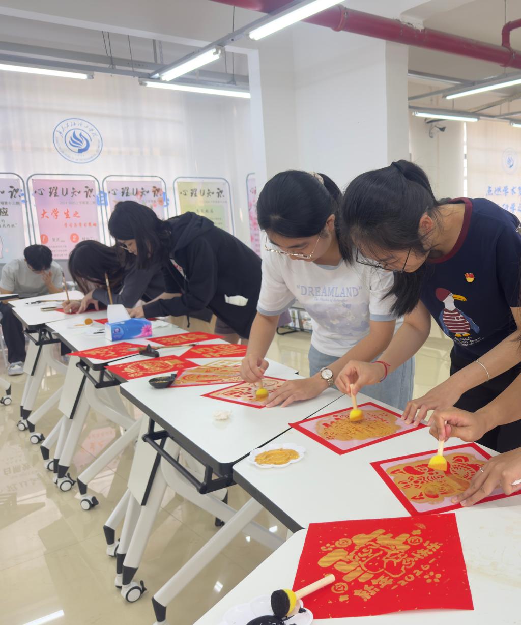 在实践环节,活动设置了“书法拓印”和“依情赋诗”等创意板块。在工作人员的细心指导下,同学们亲手制作了独具个人风格的书签、挂件等小工艺品。更有挑战性的“依情赋诗”环节,参与者根据随机抽取的情绪卡片进行即兴诗词创作,在古典诗意与现代情绪表达中寻找共鸣。最后的DIY自由创作将现场气氛推向高潮,同学们在空白卷轴、书签上尽情挥毫,一撇一捺间,或书写古诗词名句,或记录当下感悟,现场创作氛围热烈。活动尾声,优秀作品集中展示,师生合影留念,定格了这场充满文化韵味的青春画面。