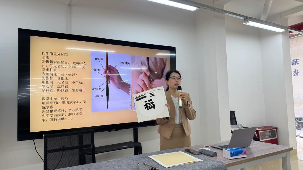 活动现场,特邀书法老师陈双谷为同学们带来了一场生动的书法入门课。陈老师系统讲解了书法的基础知识与核心运笔技巧,并以娴熟的笔法进行了现场示范,将汉字的结构之美与线条的韵律之美娓娓道来,引发了同学们的浓厚兴趣。