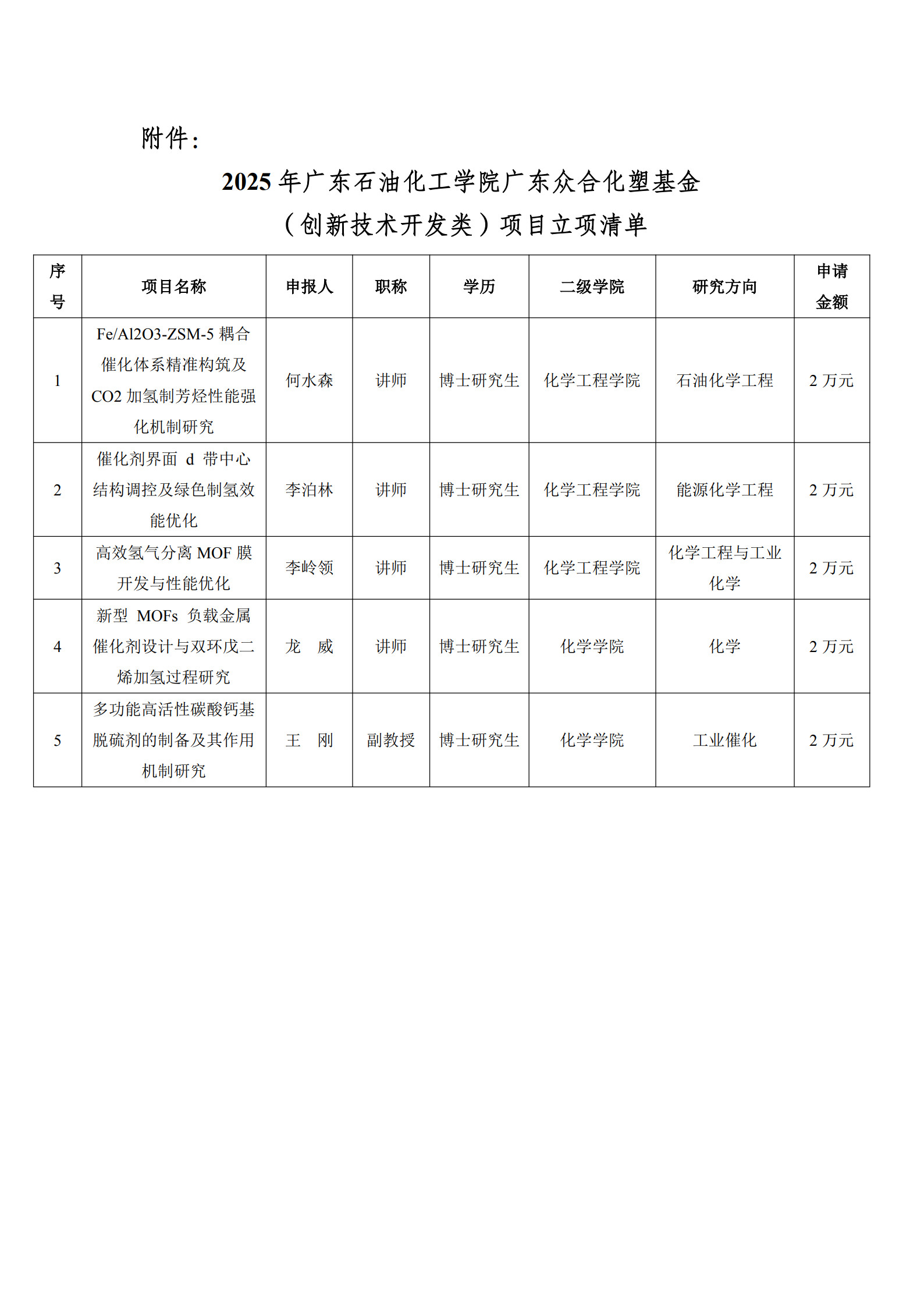 关于公布2025年广东众和化塑基金 (创新技术开发类)项目立项的通知