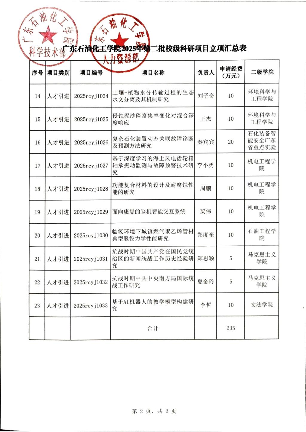 关于下达2025年第二批广东石油化工学院校级科研基金项目的通知