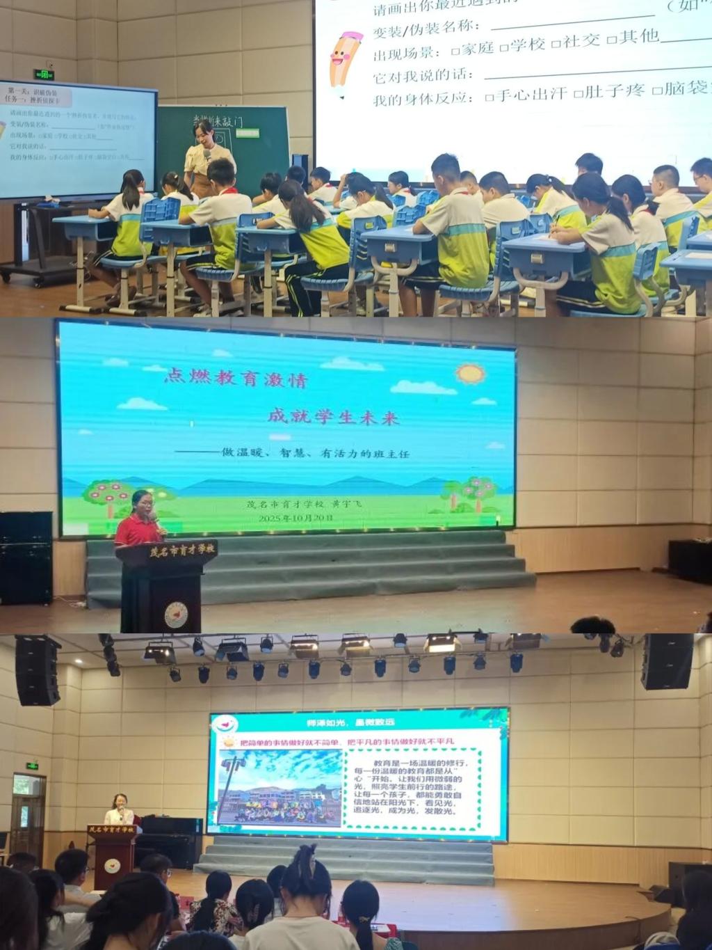 在经验分享环节,育才学校两位资深班主任分别从不同维度,为师范生传授班主任工作的实践智慧。初中部黄宇飞老师以《点燃教育激情,成就学生未来—— 做温暖、智慧、有活力的班主任》为题,结合15年带班经历,分享了她的带班理念,通过真实案例诠释了如何用爱心与智慧点亮学生心灵;小学部许清菊老师则聚焦班级精细化管理,从常规管理落实、学生成长呵护、家校沟通技巧等方面,细致讲解了系列实操方法。两位老师的分享干货满满,让师范生对班主任工作的内涵与方法有了更直观、深刻的认识。