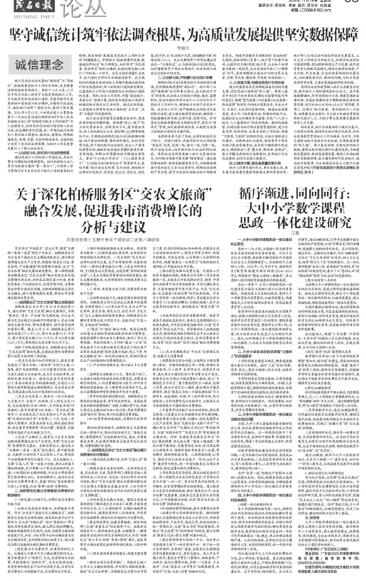 2025年12月18日,《茂名日报》论丛栏目刊发了我院江蓉教授的署名文章——《循序渐进,同向同行:大中小学数学课程思政一体化建设研究》。该文深入探讨了新时代背景下,如何打破学段壁垒,构建数学学科育人新格局。