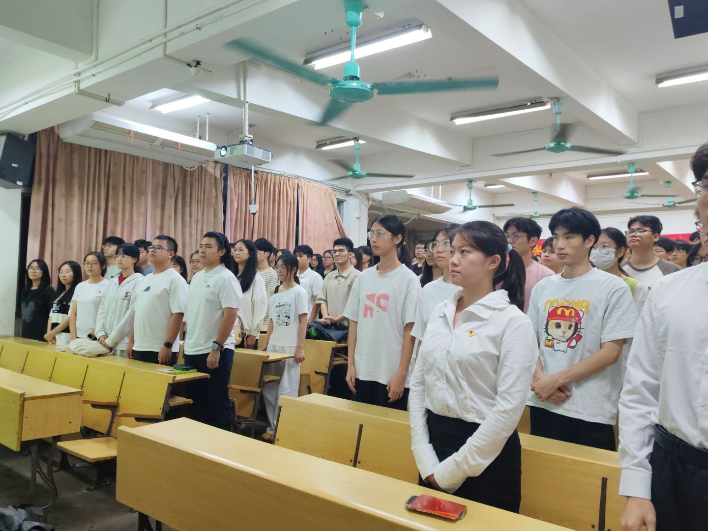 活动伊始,主持人详细介绍了活动背景、目的与流程。从红色文化在当代的时代价值,到观影活动对思想引领和丰富课余生活的意义,深入浅出的讲解让同学们对活动有了深刻认知,参与热情被瞬间点燃。随后,现场氛围庄重肃穆,全场同学齐声高唱国歌。激昂的旋律在教室中久久回荡,大家以嘹亮的歌声传递对祖国的赤诚热爱与对党的崇高敬意,为活动拉开充满正能量的序幕。