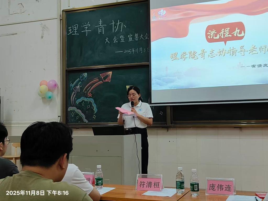 大会在全体人员齐唱《中国青年志愿者之歌》的激昂旋律中拉开序幕。理学院青志协会长潘可呈师姐率先发言,随后与会人员共同观看青志协宣传视频,重温志愿路上的温暖瞬间与坚守初心。陈彦如师姐带来志愿知识宣讲,详细解读志愿者等级认定、活动参与途径等核心内容,为新老志愿者答疑解惑;优秀志愿者代表沈子钰师姐分享亲身志愿故事,传递无私奉献的榜样力量;新生志愿者代表游梓仟满怀热忱发言,表达了对志愿服务的向往与践行承诺的坚定决心。