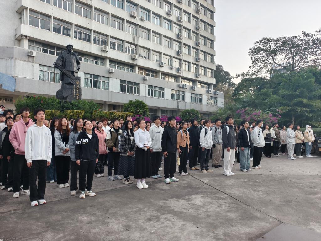 12月15日晨光洒满校园,国旗广场庄严肃穆。理学院全体师生齐聚于此,隆重举行升国旗仪式,结合公祭日缅怀先烈、致敬英雄的核心主旨开展爱国主义主题教育,以赤诚之心致敬祖国、缅怀先烈,以奋进之姿砥砺前行。活动由辅导员周洁容主持。