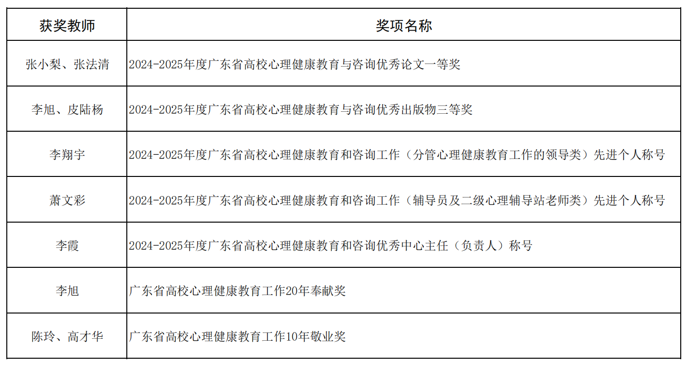 此外,在广东省教育厅近期公布的2025年“5·25”大学生心理健康月系列活动评选结果,学校师生作品获奖9项,其中一等奖5项、二等奖2项、三等奖2项,充分展现学校心理育人工作的创新成果与实践水平。