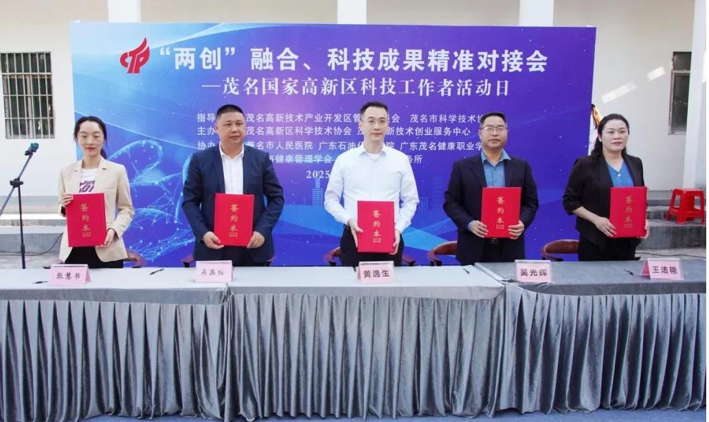 对接会期间,学校大学科技园与茂名高新区科学技术协会、茂名高新技术创业服务中心、茂名市人民医院以及广东茂名健康职业学院共同签署了五方合作协议。此次签约标志着学校与高新区、市人民医院等单位在构建产学研协同创新体系方面迈出实质性步伐,将有力推动茂名地区医疗健康与化工新材料等领域的跨界融合与技术创新发展。