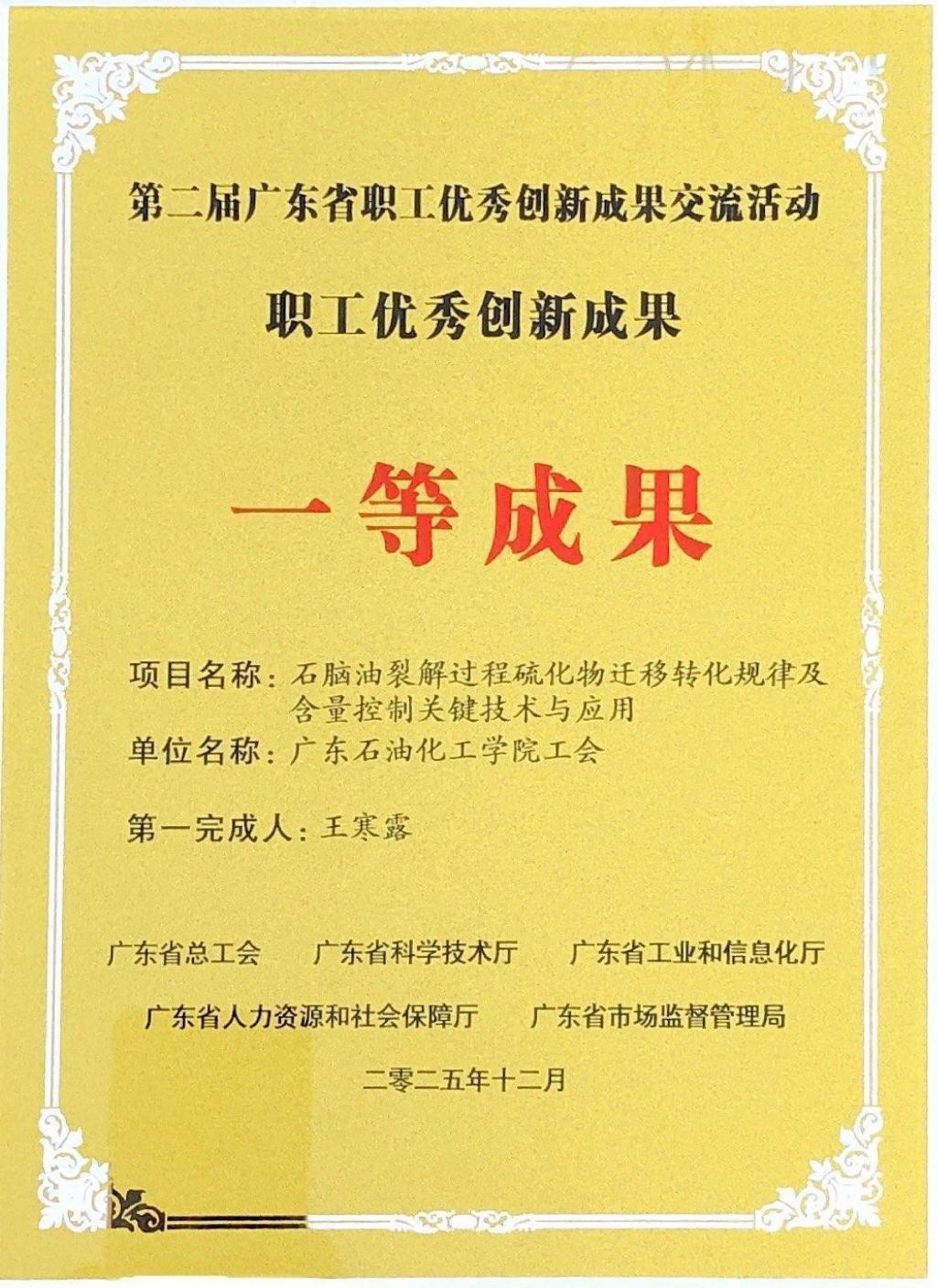 据悉,本次活动由广东省总工会、省科学技术厅、省工业和信息化厅、省人力资源和社会保障厅、省市场监督管理局共同主办,经层层选拔共评选出优秀成果100项。王寒露老师的项目聚焦石化行业清洁生产与过程优化关键技术,系统研究了石脑油裂解过程中硫化物的迁移转化行为,研发了高效的硫含量控制技术,显著提升了装置运行稳定性和产品纯度,经济效益与社会效益突出,在创新性、实用性和行业影响力方面得到评审专家的一致认可。