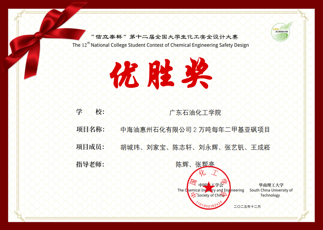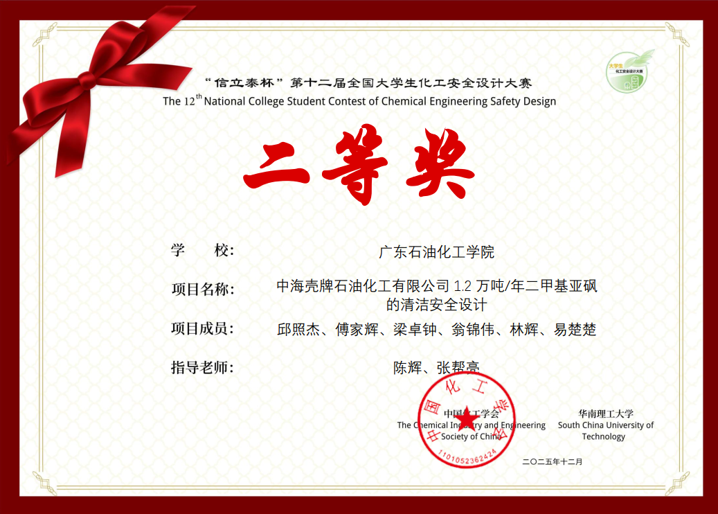 近日,“信立泰杯”第十二届全国大学生化工安全设计大赛圆满落幕。经过七个月的激烈角逐,由学校陈辉教授、张帮亮副教授指导的两支参赛队伍均获殊荣。其中,由化学工程学院与能源动力学院学生组成的“青硫素氧”团队(成员:邱照杰、傅家辉、梁卓钟、翁锦伟、林辉、易楚楚)荣获全国二等奖,“安全合砜”团队(胡城玮、刘家宝、陈志轩、刘永辉、张艺钒、王成崧)荣获优胜奖。