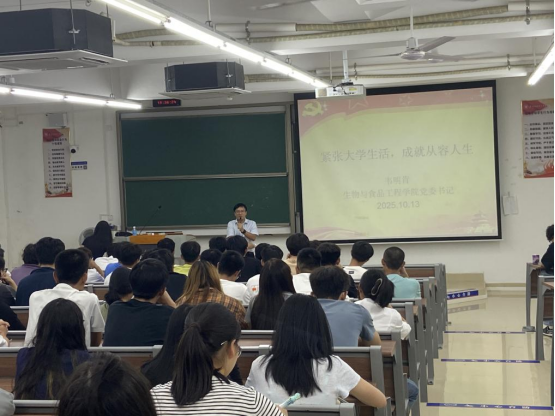 2025年10月13日,生物与食品工程学院党委书记韦明肯教授在西城校区教学综合楼J09为2025级新生上了一堂主题为“紧张大学生活,成就从容人生”的“书记第一课”。