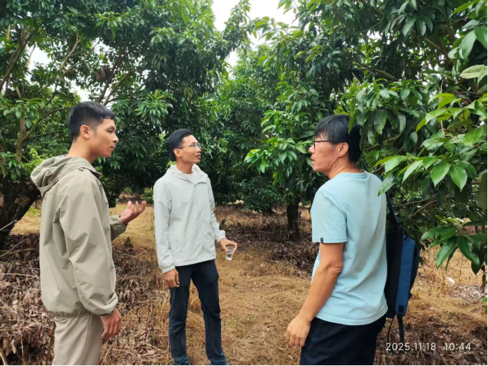 当前正值荔枝冬梢防控关键期,为帮助种植企业科学应对冬梢对次年挂果的影响,广东石油化工学院生物与食品工程学院驻茂名高州市金山街道农村科技特派员区晓阳博士和赵永国博士带领团队于2025年11月18日专程前往辖区内的茂名市众润农业科技发展有限公司荔枝种植基地,为农技人员开展荔枝“控梢促壮”技术指导,为企业送上定制化管理方案。