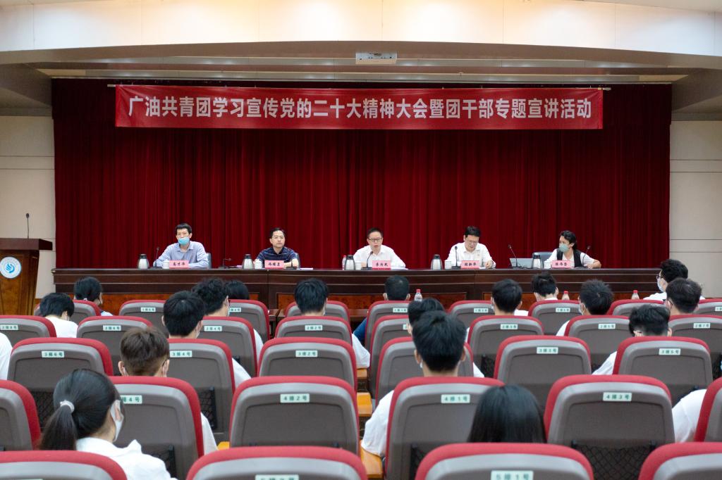为深入学习宣传贯彻党的二十大精神,11月23日下午,广东石油化工学院共青团学习宣传党的二十大精神大会暨团干部专题宣讲活动在图书馆报告一厅举行,学校党委常委、副校长李为民,校团委全体干部,二级学院团委负责人,校院两级“青马工程”学员、学生骨干代表等参加会议。会议以线上线下相结合方式进行,西城校区、光华校区设立线上分会场。