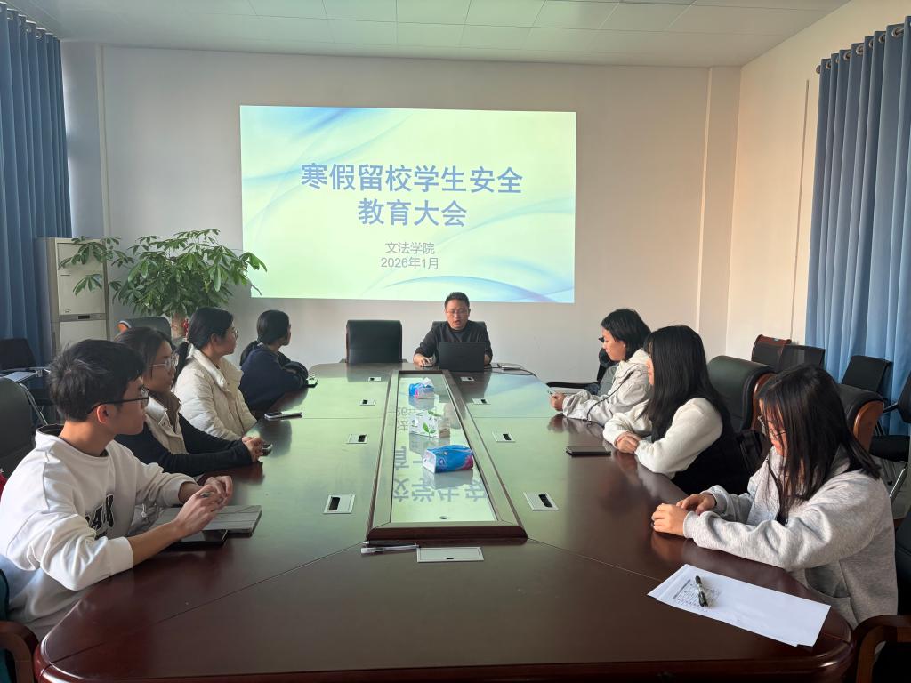 为切实筑牢寒假留宿学生安全防线,强化学生安全防范意识,2026年1月9日下午,文法学院于科技楼511室组织召开寒假留宿学生安全教育大会。学院辅导员黄文峰、詹碧云老师及全体留宿学生参会。