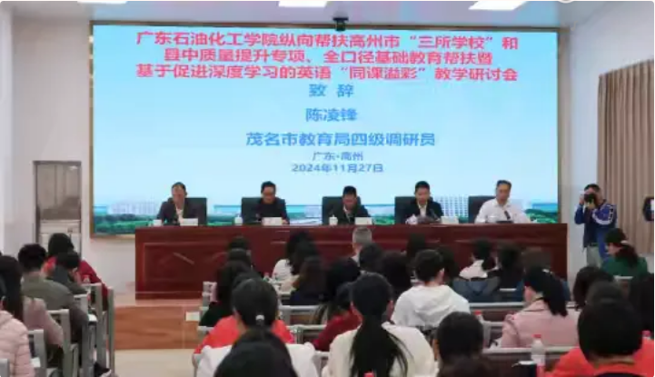 11月27日,广东石油化工学院纵向帮扶高州市“三所学校”和县中质量提升专项、全口径基础教育帮扶活动暨基于促进深度学习的英语“同课溢彩”教学研讨会在我校举行。