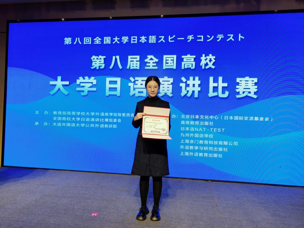 10月18日,第八届全国高校大学日语演讲比赛在大连外国语大学举行,我校外国语学院英(师)22-2班胡凯莹(指导老师:吴华霞、李琳)在本次比赛中获得了一等奖。