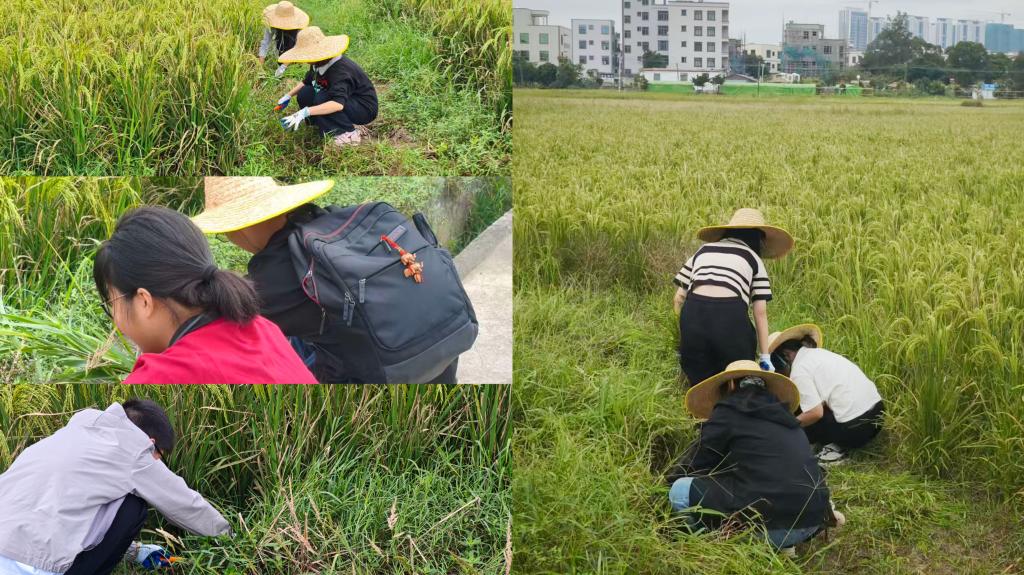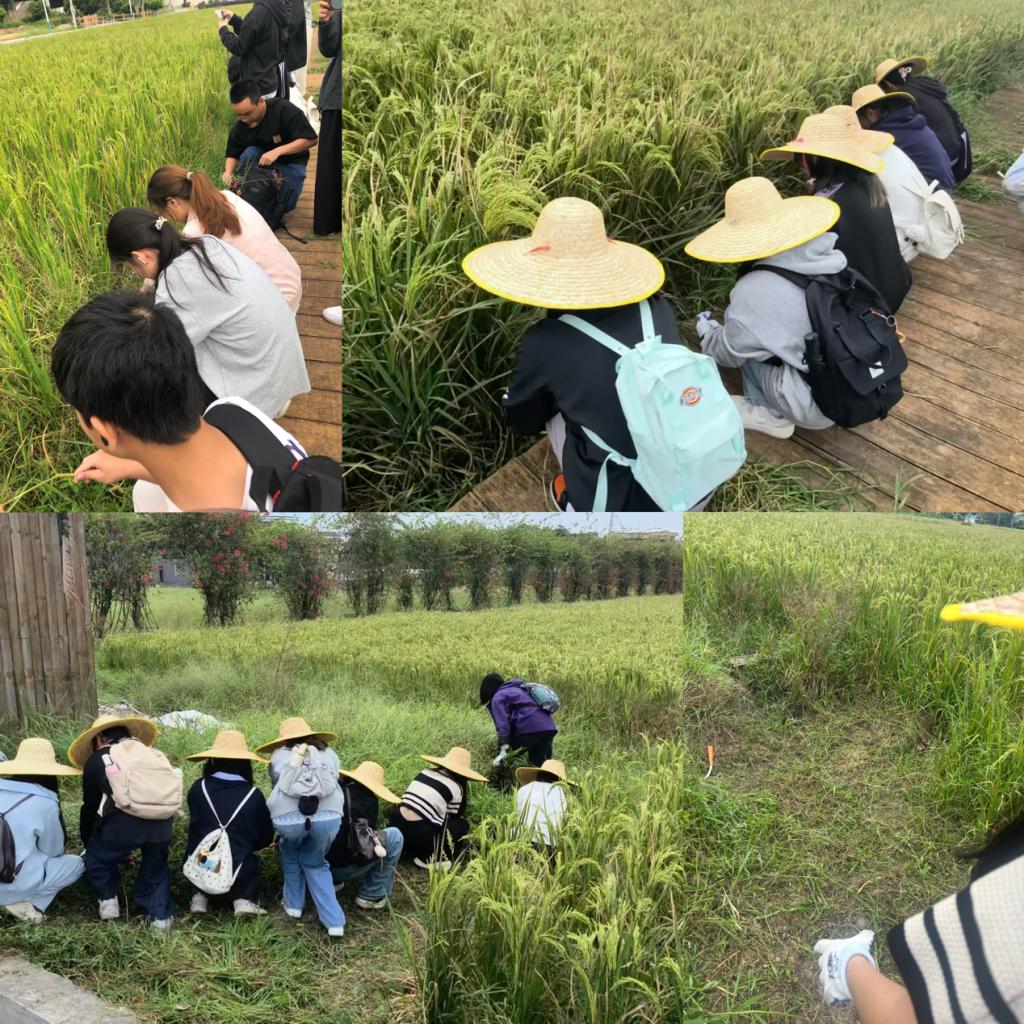 抵达基地后,实践基地指导老师先为同学们发放手套、帽子等防护与劳动工具,结合现场田垄情况,讲解水稻田周边杂草的种类辨别要点、不同杂草的拔除手法,以及避免损伤作物根系的注意事项;苏丹丹老师划分各班前往不同劳作区域,再次强调田间行走安全与工具使用规范。随后,同学们迅速以小组为单位投入劳作:有的蹲在田埂边仔细清理浅层杂草,有的借助小铲子挖除扎根较深的杂草,有的则及时将清理好的杂草归拢搬运至指定堆放点。虽秋日阳光仍有暖意,部分同学劳作后衣衫微湿,但大家始终相互配合、干劲十足,最终高质量完成了划定区域的除草任务,田间作物生长环境得到有效改善。