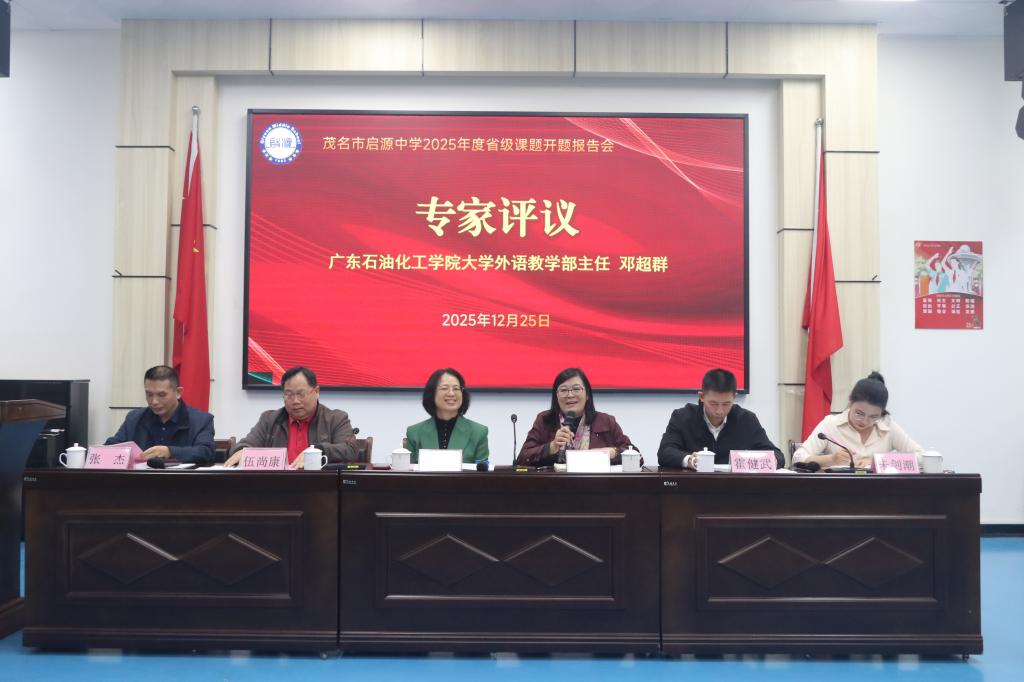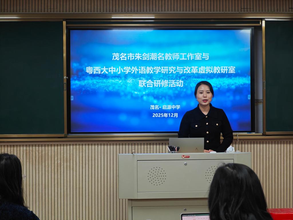 12月25日,大学外语教学部粤西大中小学外语教学研究与改革虚拟教研室成员一行,赴茂名市启源中学与茂名市朱剑潮名教师工作室联合开展研修活动。本次研修聚焦“数智赋能初中英语教师课堂教学设计能力提升策略”主题,旨在搭建校地教研协作桥梁,以数智技术助力外语教学改革提质增效。