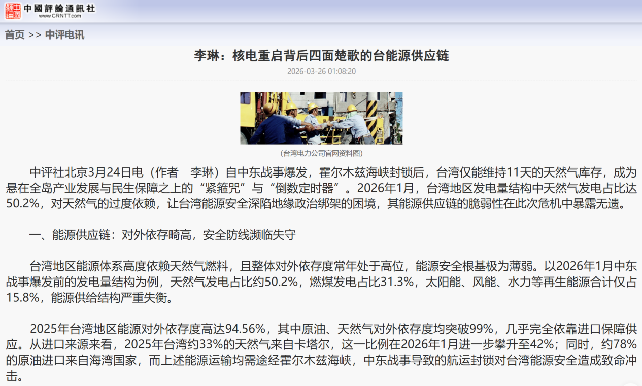 3月24日,广东石油化工学院外国语学院教师、区域国别研究院研究员李琳在中国评论通讯社《中评电讯》栏目刊发题为《核电重启后四面楚歌的台能源供应链》的文章,剖析霍尔木兹海峡封锁后深陷结构失衡、供需失策、发展失当、应对失能的台湾能源危机,提出了台湾能源破局建议。